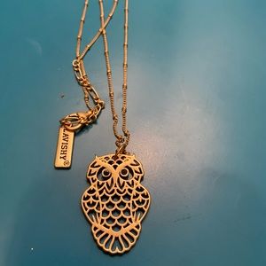 Gold owl pendant necklace with black crystal eyes. Necklace has ball detail in chain.