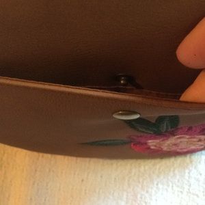 Features: Floral embroidery, front snap pocket, adjustable strap, zipper pull, vegan leather