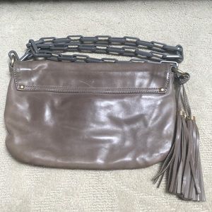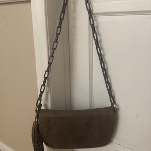 This is a shoulder bag that can be worn crossbody. It’s in a soft taupe grey leather, double tassels detail with a long plastic chain strap with a double flap/compartment with magnetic closures. There signs of wear and two small black ink marks on the back of the purse. The insides are very clean. Jcrew dust bag included. Measures 7.5” x 11.5”