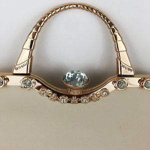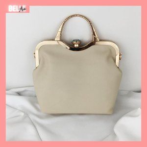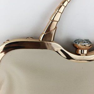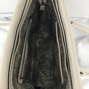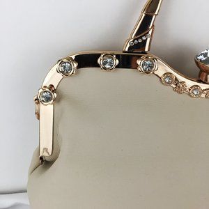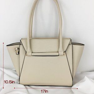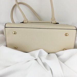 Light cream color tote & embellished satchel set. Tote has 10 inch drop straps attached & can be converted into shoulder bags with adjustable shoulder strap (included in purchase). Items are made of faux-leather material & gold-tone accents.