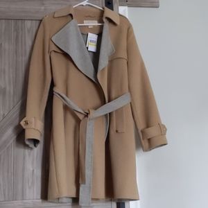 NWT Michael Kors wool jacket. Tan outside, gray inside, gold embellishments. Wrap style with tie belt.