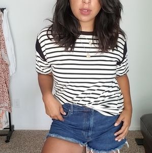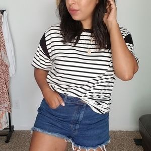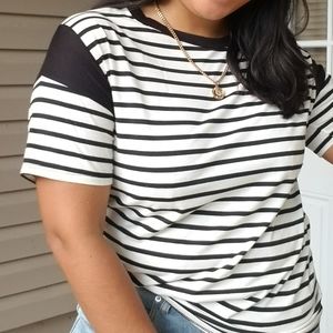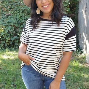 A tee that meets all your athleisure needs! Loose fitting. Striped. Bold stripe on shoulder. Short sleeves. Super roomy perfect for lounging or running errands in style! Black white.