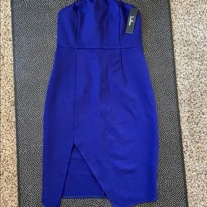 Strapless navy blue bodycon dress with high slit