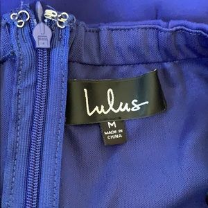 Strapless, light navy blue dress with zip up back. Thigh slit, skirt length hit at knee.