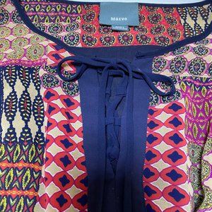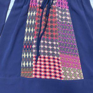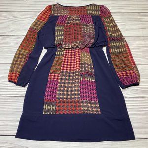 Flowy and boho chic Anthropologie Maeve Rosalie Peasant Dress! Beautiful Blue draped dress with patchwork geometric pattern panels on front and back, with 3/4 length sleeves and a tie waist. Fully lined. In great condition!