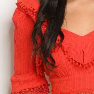 This BOHO RED TOP features Short puff sleeves and crochet trim.