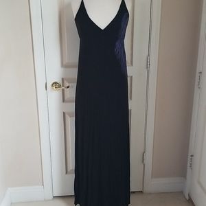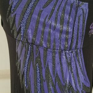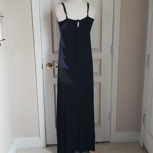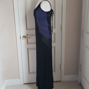 Gorgeous! Beads and glitterized graphic down one side. Adjustable straps. Ties in the back. The material is slinky, cool to the touch and stretch. High end. Length 58" from top to bottom. No size tags, but this is a small