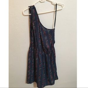 One shoulder BCBGeneration cocktail dress. Dark teal color with an abstract dotted stripe. Size Small. Light, woven fabric made of polyester. Drapes beautifully and is in great condition!