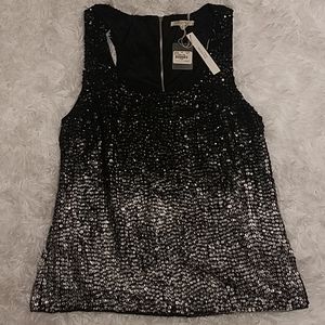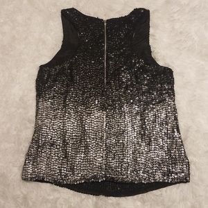 One of a kind hand made shirt - no two are the same. The interior lining is 100% Silk, and the outside is embellished with a gorgeous ombre of black, gray and silver sequins. Zip back closure