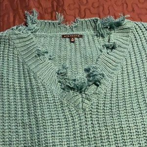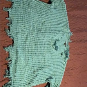 Teal oversized V-Neck sweater. Distressed at neck, bottom of sweater, and bottom of the sleeves. Size M. Perfect for the Fall weather.