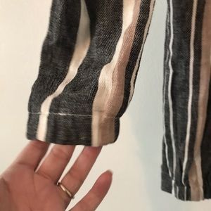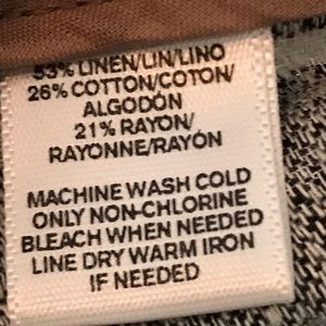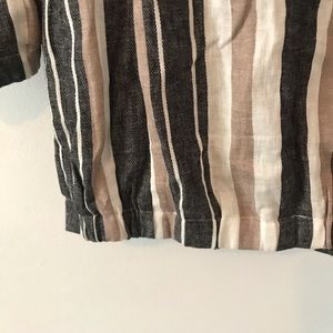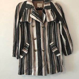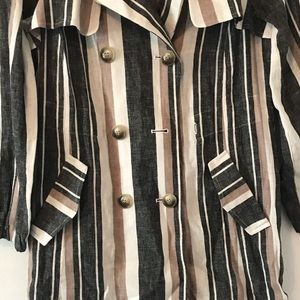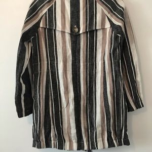 NWOT Loft Linen Button up Jacket size XXSP Petite. Colors are white, Beige and like a denim gray. No the button is NOT missing on the jacket I just forgot to button it for the photo. The belt is missing. There is light elastic around the wrist and bottom of jacket. Measures 29” long and 19” from pit to pit.