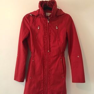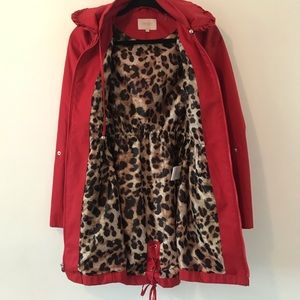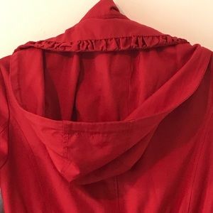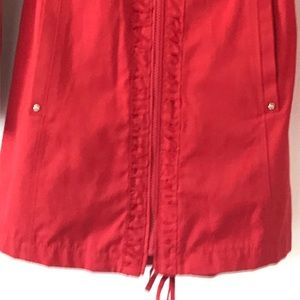 Laundry by Shelli Segal Red Jacket with hood XS. Like New! Collar flips up or down, tail of coat has criss cross tie. Animal print interior. Made in Los Angeles. Measures 31” long and 18” from pit to pit and waist measures 15” on elastic waistband.