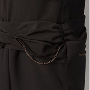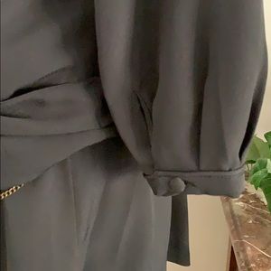 This scoop-neck dress features cords and curb chains at the twisted, pleated asymmetrical sash. Piping at neckline and at yoke. Peek-a-boo lining at shirttail hem. Pleats at waist and at single-button cuffs. 3/4 sleeves. Lined at skirt. In excellent like new condition.