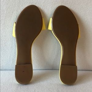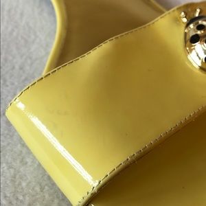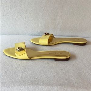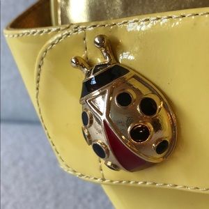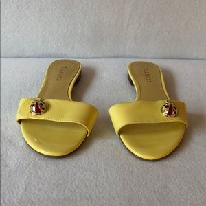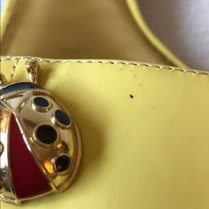 These Talbots sandals feature an enamel ladybug fastened onto a classic single-strap slide. The shoe is a sunny yellow patent leather.