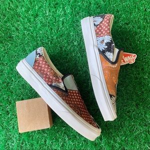 The Tiger Patchwork Classic Slip-On features sturdy low profile slip-on canvas uppers with an allover tiger floral print, padded collars, elastic side accents, and signature rubber waffle outsoles.