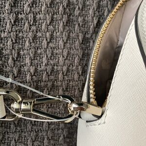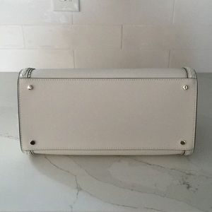 Brand new never been worn. Smooth leather comes together with a textured body and braided detail for an eye-catching satchel. Dual top rolled handles. Detachable, adjustable shoulder strap. Zip-around closure. Exterior features crosshatch leather construction, silver-tone metal, metal feet and removable tag - Interior features zip wall pocket and media pockets - Approx. 9" H x 12" W x 6" D - Approx. 7" handle drop, 20.5" - 23" strap drop. Comes from a pet/smoke free home.