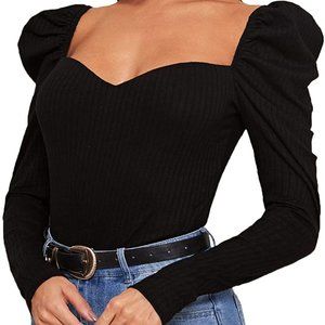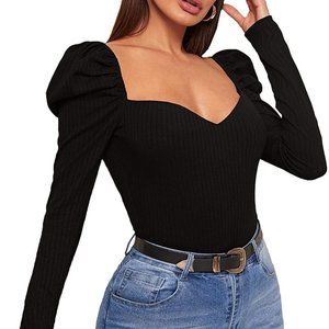 Solid basic, square neck, puff sleeve, rib-knit, casual tee shirt
