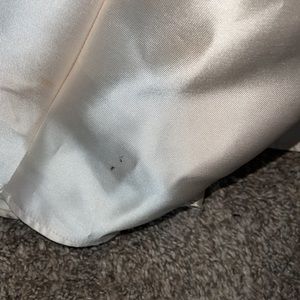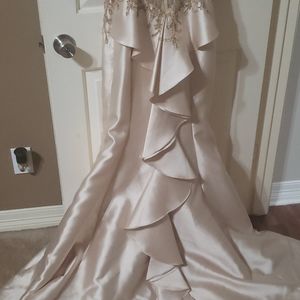Champagne color. This dress got LOTS of compliments. Great condition. A couple small spots on the train, barely noticeable. See pictures. A little bit of airbrush make up on the neck line. I did not try to get out. Price reflects minor flaws. Very heavy. Smoke free home.
