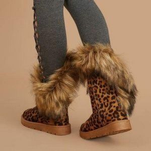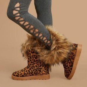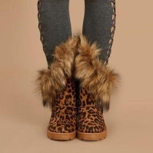 Asymmetrical Faux Fur Pull On Boots in Leopard Live in these all fall and winter, super comfy and really stylish! Pair these with your favorite jammies or distressed denim.. PRODUCT DETAILS: Sole: Rubber Upper: Man Made Suede & Faux Fur Pull On Style Shaft Height : 9.5" Heel Height : 1" Fit: True To Size (Available in Leopard & Tan, check other listings) leopard cheetah winter boots rain boots trendy stylish fur lined boots comfy boots Uggs asymmetrical fur boots suede boots