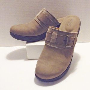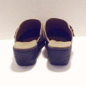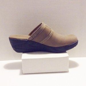 These b.o.c. Born Concepts "Mallis" taupe color nubuck leather and suede wedge clogs are so comfortable and will make a great addition to your fall wardrobe. Very Good pre-owned condition. Only flaws are a couple of very tiny dark marks on the toes, which are hard to see in the pics (left shoe inside toe area).