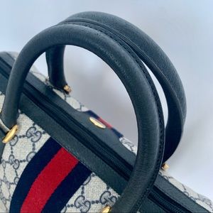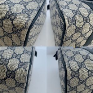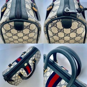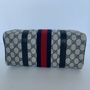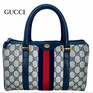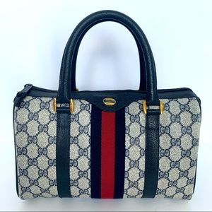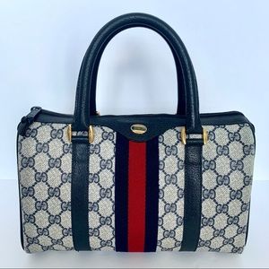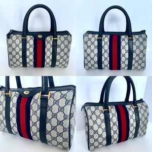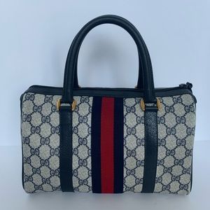 100% Authentic!! Gorgeous 1980s Vintage Gucci Navy blue Boston Bag, From 80s. Accessory Collection, GG Monogram Coated Canvas, Satchel Bag. This bag is in a very good vintage condition, no tear or stains in the outside, little and normal signs of the age. handles and corners are good please see pictures.
