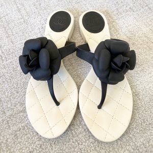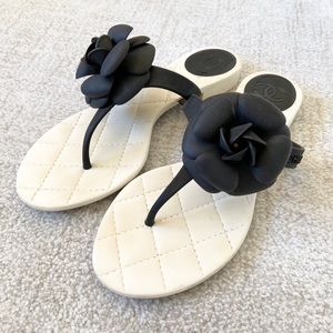 CHANEL Camellia Flower Rubber Thong Sandals Black & White