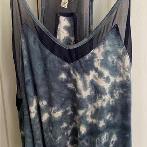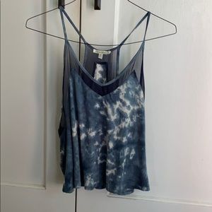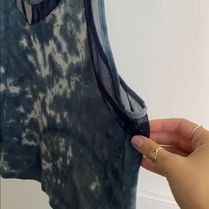 This is an expensive shirt from a boutique it is blue and white tie dye with sheer lining on the sides. No flaws