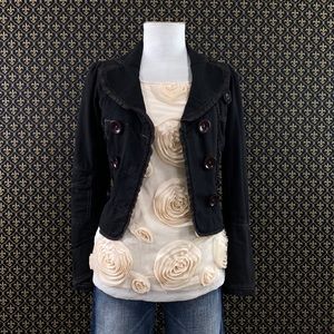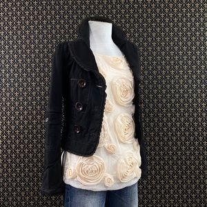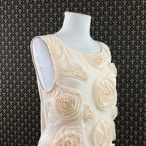 Ivory colorway. Great condition, relaxed fit, Pull over style, lined front portion. Poly/nylon/viscose/spandex fabrication. Knit back, woven front. Meaurements are approximate and taken with the garment laid flat and unstretched: 25.5” length, 19” armpit to armpit.