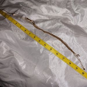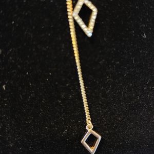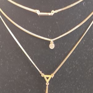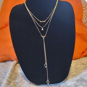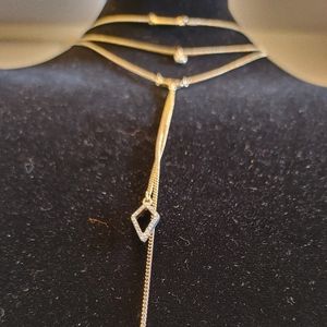 Gold tone rhinestone multi-layered necklace. Free necklace lair on top with two diamond shaped golden rhinestone pendants.