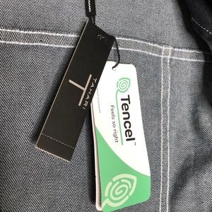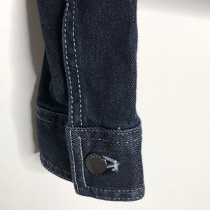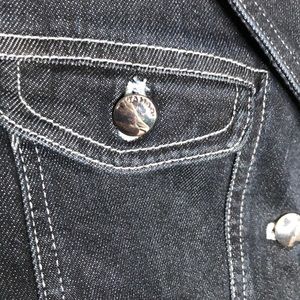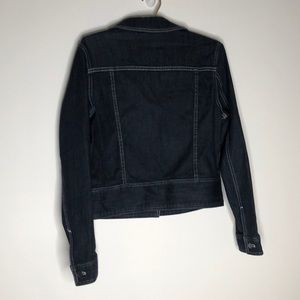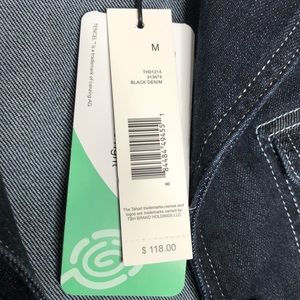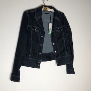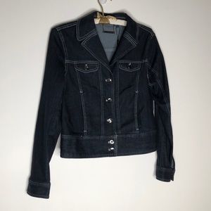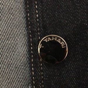 Tahari dark blue denim with white stitching jacket Medium long sleeves NWT. Measures 21 inches long, 18 inches across chest and sleeves measure 24 inches long. Dark wash. Sliver buttons. Faux pockets. 72% cotton 27% tencel 1% spandex. Has some stretch. Machine washable. From smoke free home.