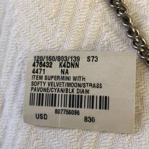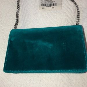 Authentic. Received as gift. Worn once. Rare color. Minor velvet discoloration not sure how that happened. Turquoise suede with turquoise detail; tiger head; palladium-toned hardware; attached key ring that can attach to a separate bag chain shoulder strap with 23.5” drop.