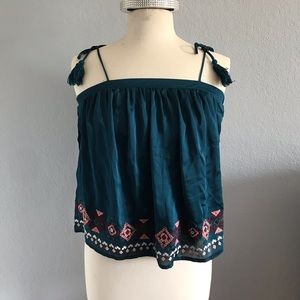 Rich teal color with embroidery. Elastic in the back for better fit and tie shoulders with tassels. Lining layer same color teal.