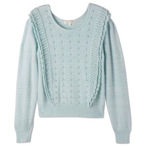 The lovely Jasmine Pullover arrives in feminine angora pointelle. This lightweight sweater features a three dot bud motif across the bodice. The princess seams-at front and back-are lined with a double-layered scalloped ruffle with a thatched weave. Wide cuffs trim the long puffed sleeves and bottom. Retail $375.