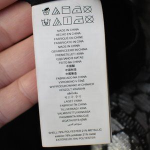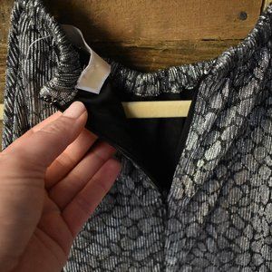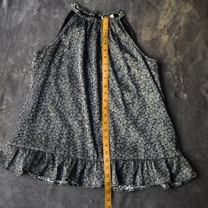 Pre-Owned MICHAEL Michael Kors metallic halter top. Straps are a chain metal. Zipper and hook on back. Black polyester lining. Exterior is polyester and metallic threads/ribbed texture, animal print with ruffled bottom detail. Perfect for a holiday party or an night out with friends.
