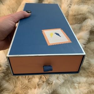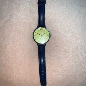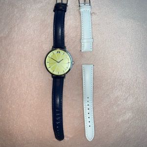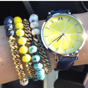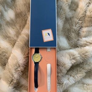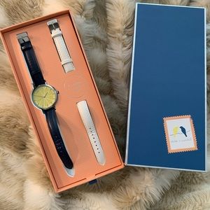 This Chloe & Isabel convertible watch set comes with two leather bands - in navy and white - with a lemon and white print face. It has shiny silver details and is gorgeous. The battery is dead but the watch has so much life! Comes in original packaging.