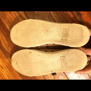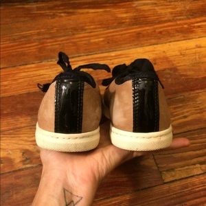 Tan colored leather w/ black patent detail on toe caps. Black ribbon laces give these sneakers a sweet, feminine touch!