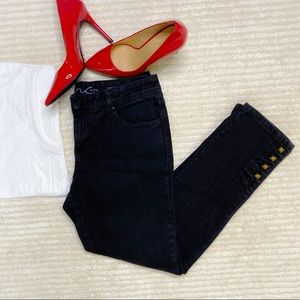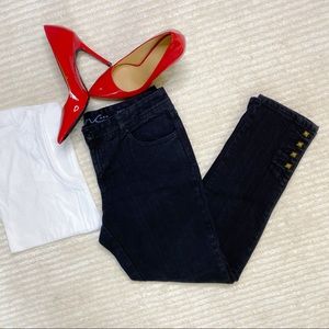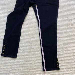 INC black denim skinny jeans with bronze colored buttons at the ankles. Slim fit, skinny leg. Cotton/spandex blend.