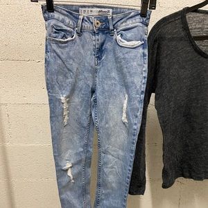 Cute long sleeve casual shirt with gold zipper pocket on the front paired with casual ripped jeans perfect as an everyday outfit. Shirt is a size Large and Jeans are a size 2