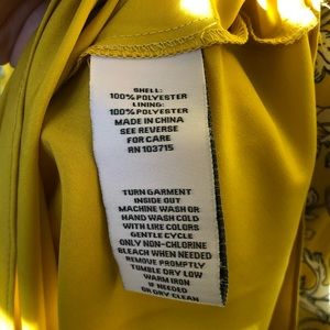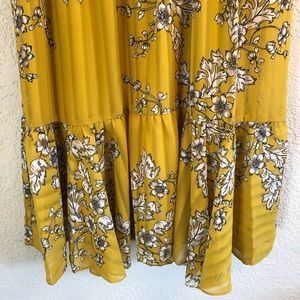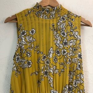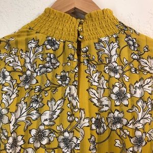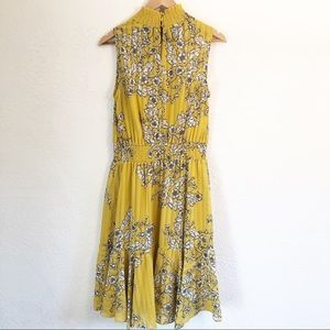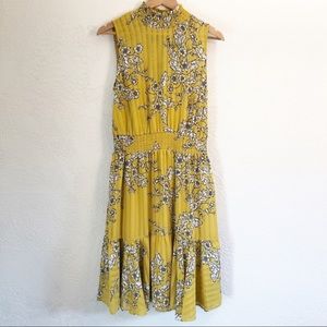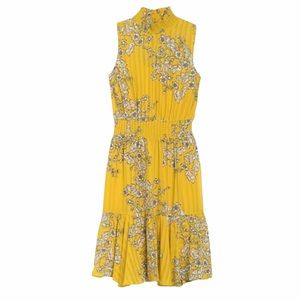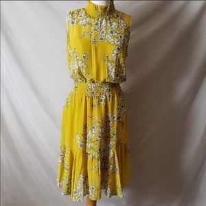 EUC. Excellent condition. Vivacious floral printing decorates a sleeveless dress with a smocked neckline & ruffled hemline. Has an interior slip/lining. Yellow, black, & white. Smocked neck. Sleeveless. Allover floral print. Ruffle trim/flounce hem. Print is called Golden Cypress. Size 10.