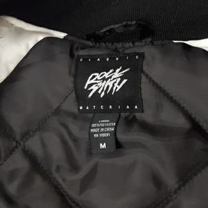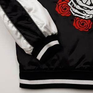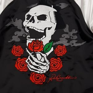 Super cool zip up satin bomber with ribbed cuffs and waistband, quilted lining, sleeve taping and piping details and fully embroidered awesome skull artwork on front and back. Super unique piece that noone else will have! I wore this a few times but need to make room in my closet!