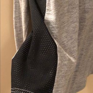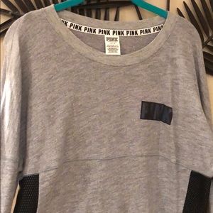 Lightweight grey sweatshirt with side mesh detail ( not see thru mesh ) PINK logo written across back in metallic like blue colors & on front corner.