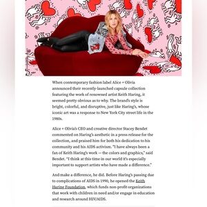 A &O did a collection around internationally famous American artist, Keith Haring whose pop art and graffiti like work work grew out of the NYC street culture or the 1980’s. Madonna wore one of his pieces on her Like a Virgin tour. This is a highly sought after jacket. Underarm to underarm 17” sleeve 23” length 19”. Worn once. Original price $1200.