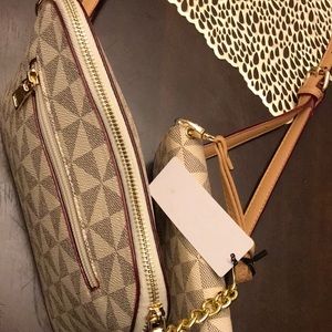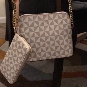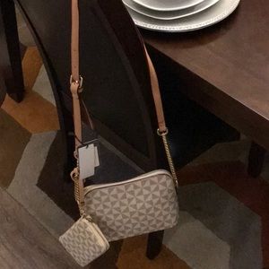 Cream and tan colored crossbody with detachable wallet, gold hardware, one center compartment, two small pockets inside, one outside pocket with long shoulder strap.