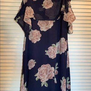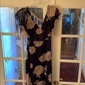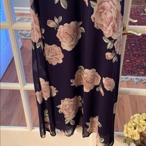 Lulu’s navy blue with heathered pink roses. Lined gown. Perfect for wedding, dances, or any special occasion. Just a beautiful dress! Worn once!