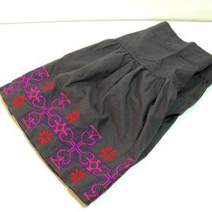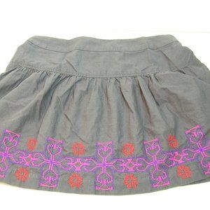 A short cotton mini skirt from American Eagle Outfitters. It is a brownish-grey with a bright red, pink and purple cross stitch border.