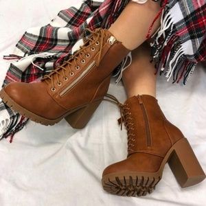 Give yourself an edge up on the day in these edgy combat boots! Designed from faux leather, these tough boots feature a heavy rubber tread and an approx. 3" heel. They lace all the way up and have a zipper running parallel along the outside edge of the laces, adding extra flare!