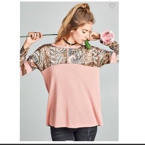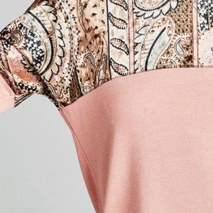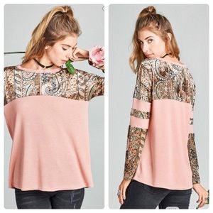 Pretty & feminine Pink Lighweight sweatshirt like varsity top with crushed velvet contrast in a paisley print of pink & brown! Body is 32% polyester & 68% rayon! Contrast is 97% polyester & 3% spandex! You will love this top!
