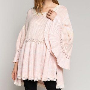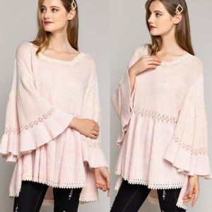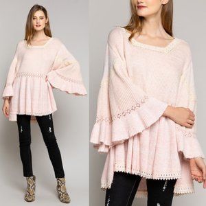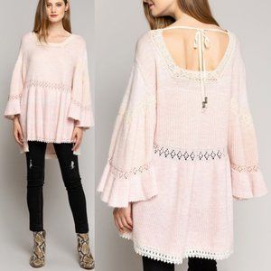 Pink Flutter Bell Sleeve Lace Boho Tunic Sweater