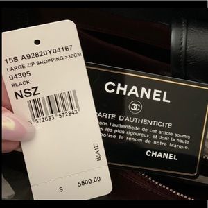 Black quilted leather Chanel Large Shopping tote bag with silver-tone hardware, dual flat top handles, single flat shoulder strap, single exterior pocket with magnetic snap closure, protective feet at base, three interior compartments; one with zip closure, maroon canvas lining, three pockets at interior walls; one with zip closure and magnetic snap closure at top. Includes box and dust bag