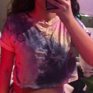 blue pink and yellow tie dye with black moon outline and stars on left side. worn twice.